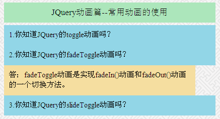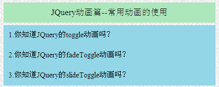 slideToggle方法用来实现交替显示向上向下滑动动画效果,如果之前是下滑显示,则slideToggle()可向上滑动它们,反之slideToggle()可向上滑动它们。其基本语法为: