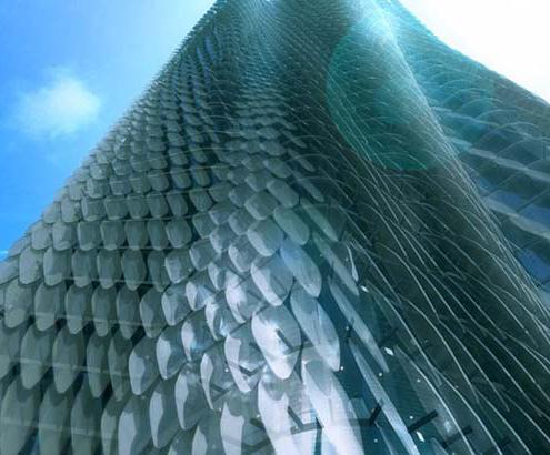 热反射玻璃是表面用热、蒸发、化学等方法喷涂金、银、铝、铜、镍、铬铁等金属及金属氧化物或粘贴有机物薄膜而制成的镀膜玻璃。热反射玻璃对太阳光具有较高的热反射能力,热透过率低,一般热反射率都在30%以上,最高可达60%左右,且又保持了良好的透光性,是现代最有效的防太阳玻璃。热反射玻璃具有单向透视性,其迎光面有镜面反射特性,它不仅有美丽的颜色,而且可映射周围景色,使建筑物和周围景观相协调。其玻璃背光面与透明玻璃一样,能清晰地看到室外景物。热反射玻璃适用于现代高级建筑的门窗、玻璃幕墙、公共建筑的门厅和各种装饰性部位,用它制成双层中空玻璃和组成带空气层的玻璃幕墙,可取得极佳的隔热保温及节能效果。