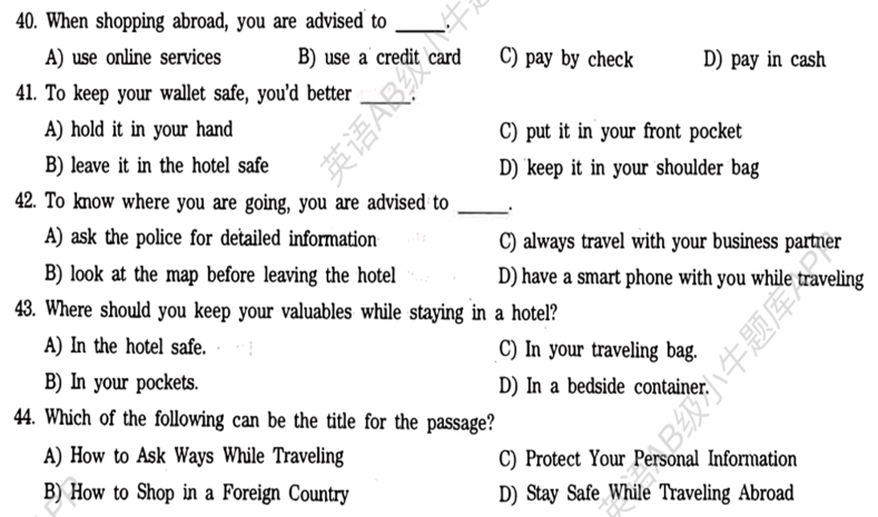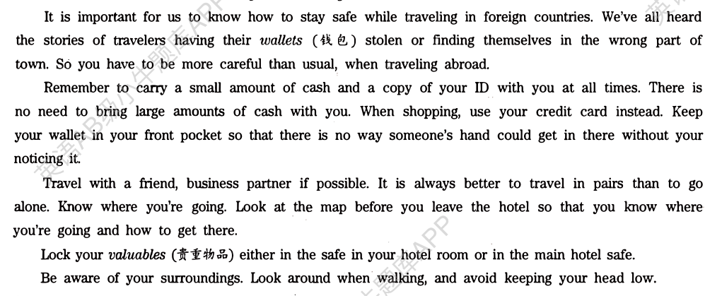 II. 介绍Task1-5的考查内容: Task 1 (多项选择) 理解一般性短文 Task 2 (多项选择) 应用文或图文描述 Task 3 (大纲填空) 填写应用文关键信息 Task 4 (匹配) 英汉术语配对 Task 5 (简短答问) 理解应用文后回答问题 III.介绍Task1-5的分值比例: 本部分阅读量为800-1000词,共5篇文章,23题,得分占31%,时间为35分钟。5篇阅读材料,题型有4种: 1)选择题:2篇应用型题材的文章,共8题,得分占 16%; 2)填空题:1篇实用性文章,共5题,得分5%; 3)匹配题:1组专业术语,共5题,得分占5%; 4)简答题:1篇实用性文章,共5题,得分占5%。 | 熟悉阅读题型,感知题目考查内容和要求。 | ||||||