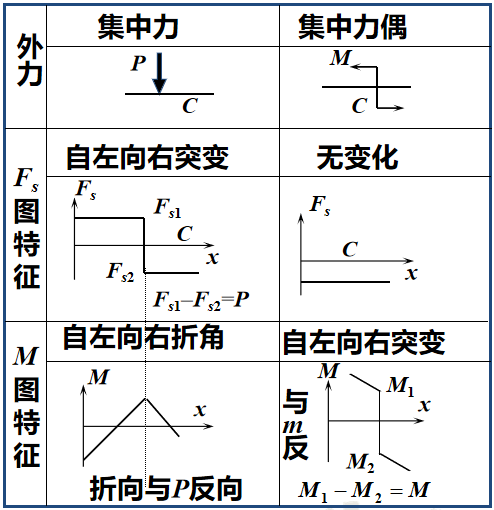 4. 在集中力作用截面的左右两侧,FS图有突变,突变值等于此集中力的大小, M图在此发生转折;在集中力偶作用截面的左右两侧, FS图无变化,M图有突变,突变值等于此集中力偶的数值。
