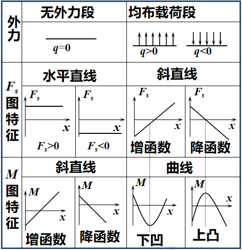 2. 若q(x ) =常数,则FS(x )是 x 的一次函数,对应FS图为斜直线;M(x )是 x 的二次函数,对应M图为抛物线。