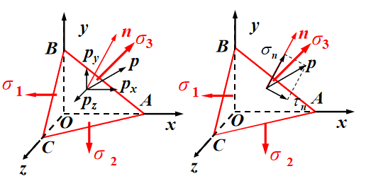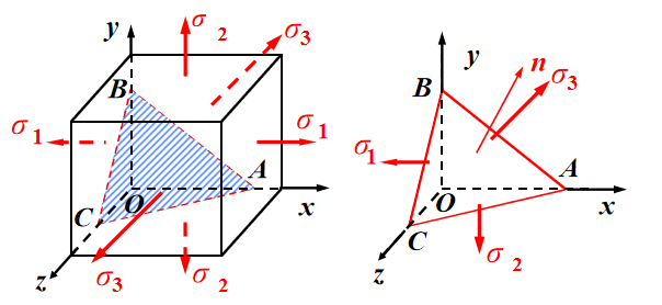 设斜截面 ABC 法线 n 的三个方向余弦为:l , m , n