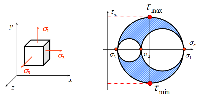 弹性理论证明,左图单元体内任意一点任意截面上的应力都对应着右图的应力圆上或阴影区内的一点。
