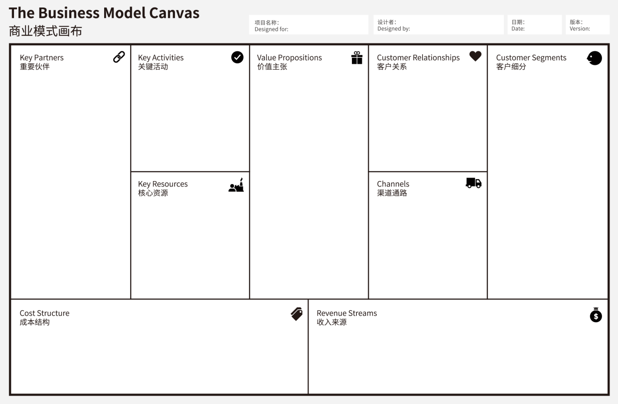 价值主张、重要伙伴、核心能力、关键资源、客户关系、渠道通路、目标消费群体、成本结构、收入来源。