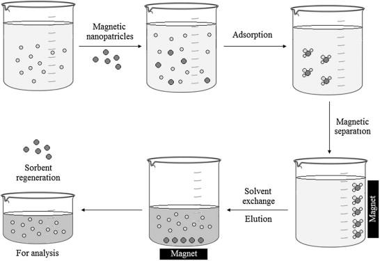 磁性固相萃取(magetic-solid phase extraction,简称M-SPE)是21世纪在分离富集领域的革命性技术,也称为磁纳米,微萃取技术。基于液-固相色谱理论,M-SPE是以磁性或可磁化的材料作为吸附剂的一种分散固相萃取技术。在M-SPE过程中,磁性吸附剂不直接填充到吸附柱中,而是被添加到样品的溶液或者悬浮液中,将目标分析物吸附到分散的磁性吸附剂表面,在外部磁场作用下,目标分析物随吸附剂一起迁移,最终通过合适的溶剂洗脱被测物质,从而与样品的基质分离开来。