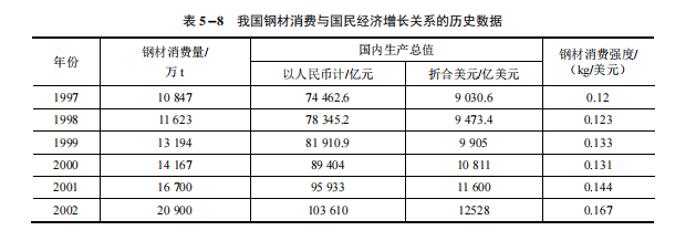 由表 5−8 可见,随着我国国民经济结构的变化和工业化程度的进步,钢材的消费与国民经济增长的相关系数在逐年增大
