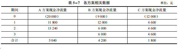 2. 已知贴现率为 10%,有三种投资机会,有关数据如表 5−7 所示,要求:应用 NPV 函数和 IRR 函数分别计算三种方案的净现值、内含报酬率、现值指数。
