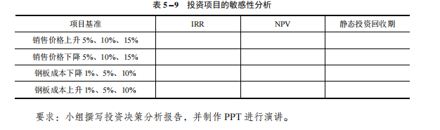 (5)管理者对该项目进行投资决策分析的要求静态评价指标:静态回收期 PP= 平均报酬率 ARR=动态评价指标:净现值 NPV= 内含报酬率 IRR=(6)项目利润及财务效益评价敏感性分析:项目最敏感的因素为销售价格。当销售价格上升或者下降时,IRR、NPV和静态投资回收期为多少?项目对成本敏感性较强,当钢板成本下降或者上升 5%、10%、15%时(见表 5−9),IRR、NPV 和静态投资回收期为多少?公司管理层掌握这些信息对项目投资决策至关重要。
