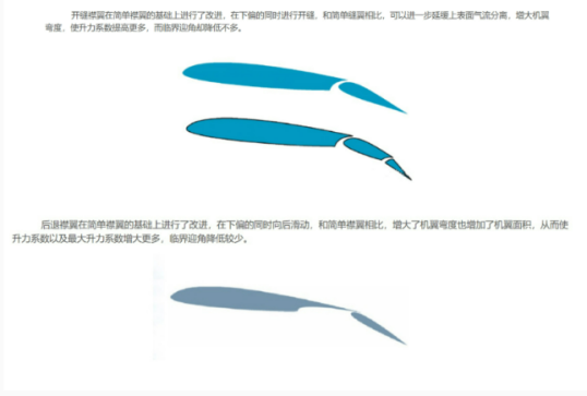 升力系数的大小主要与迎角、机翼弯度、机翼厚度等因素有关。我们可以通过增大临界迎角和机翼弯度,来达到增大最大升力系数的目的。但是在增大临界迎角和机翼弯度的同时,会导致机翼上表面的气流分离,使升力骤降,出现失速现象,所以我们在机翼前缘采用了带缝的襟翼,也就是前缘缝翼。