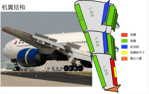 飞机操纵扰流板主要作用:阻挡气流的流动,增加机翼迎风面积,从而增加阻力(压差阻力),拖慢速度,减小升力。