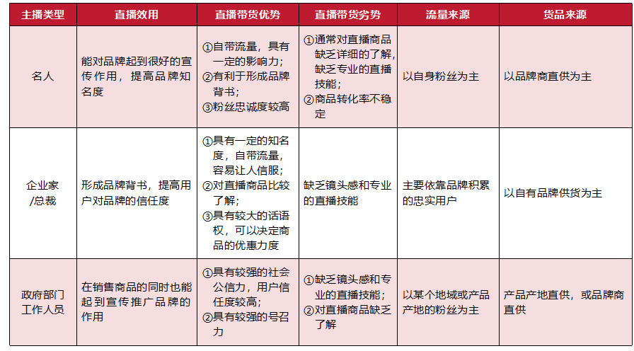 随着直播电商的火爆发展,直播主播的类型越来越多,主要包括以下6类主播。
