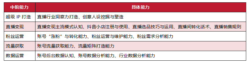 主播的中阶能力包括超级IP打造、直播变现、粉丝运营、流量获取、数据运营等。