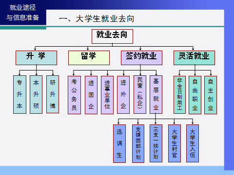 随着我国经济社会的不断发展和高等教育改革的不断深化,当代大学生的就业观发生了显著变化,呈现出多样化、多元化和复杂化的特点,主要集中在升学、出国和签约就业,另外还有灵活就业、自主创业等去向。