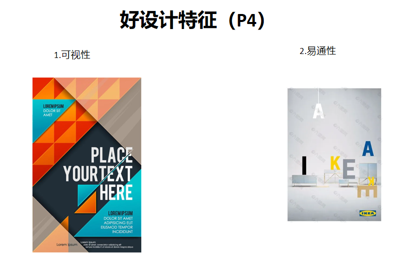 第一章叫做日用品心理学,第一个地方就是说要好设计的特征,第一个叫可视性,第二叫异通性。可视性的意思是说我们所涉及的产品能不能够让用户明白,能不能让用户明白怎么操作是合理的,在什么位置以及如何操作?那一通性的意思就是说,唉,我们所设计的这个产品到底是想表达什么意图?所有不同的控制和装饰都起到什么样的作用?所以这两个部分其实理解起来还是比较好理解的。