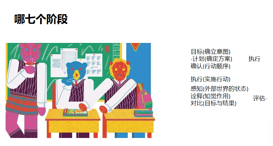 我们来下面看一下,到底行动七个阶段是哪七个阶段呢?首先说叫目标,第二个叫计划,第三个叫确认,第四个叫执行,第五叫感知,第六个叫诠释,第七个叫对比,那前三个目标、计划和确认就是用户所思考它到底怎么操作的细分的三个环节。那中间这个执行就是实际的执行,后面三个感知、诠释和对比是用户会思考,那我执行完之后会得到一个什么样的结果的三个环节?OK,还是比较好理解的好,我们前面讲完关于用户行动的 7 个层次之后,我们下面再看一个知识点,叫用户视角的理解的 3 个层次。那这里面也是辅助我们去了解到底用户行动的过程,就是我们那个叫执行和评价两个过程,通过用户认知的一个这个知识点,通过用户认知这个视角来理解,那认知这个视角的话,它一共分为哪三个层次?第一个叫本能层,第二叫行为层,第三个叫反思层。那这三个层次分别是什么意思?本能层更说的是什么?就是一种感官感受,就是我们作为用户,我们看到什么东西,唉,或者是我们拿到了什么东西,你看到是什么感觉?它好看吗?还是不好看,对不对?它给你什么感受呢?它你拿到之后它的触感怎么样?它重不重?它会不会觉得质感很高级呢?对不对?叫本能层,第二叫行为层,行为层讲的就是说当我看到这个东西,当我摸过它的时候,我就想把它用一用,使用起来看看怎么样。