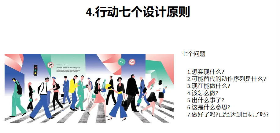 下面叫行动的 7 个设计原则,我们前面讲到了 7 个问题, 7 个阶段,对吧? 7 个阶段对应到 7 个问题,那下面就会有 7 个原则,那七个问题是什么呢?第一个问题叫想用户想实现什么?第二个是可能替代的动作序列是什么?第三个是现在还能做什么?第四个该怎么做?第五个出什么事儿?第六个这个是什么意思?第七个我现在做完了吗?我做完之后有没有达到我的目标呢?所以这七个问题就完全对应到上面的 7 个用户的一个行动的阶段,那有了这七个问题之后,我们其实把这个过程拆解的就更加进一步了,对吧?那么就怎么样呢?那么接下来就需要通过 7 个原则,通过 7 个设计方法来对应到这 7 个问题
