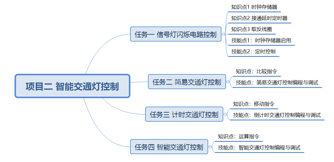 根据控制要求不同,将本模块分为四个难度逐级递增的交通灯控制任务。本模块涉及的知识点有系统和时钟存储器、定时器、取反线圈指令、比较指令、移动指令、减法指令、跳转与返回指令、判断与选择指令等。通过本模块的学习,能够实现闪烁控制、定时控制、倒计时控制、智能交通灯控制等。