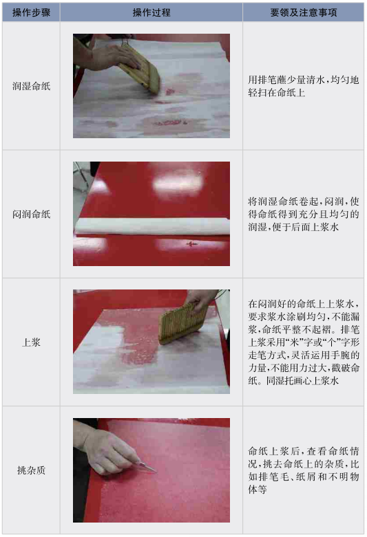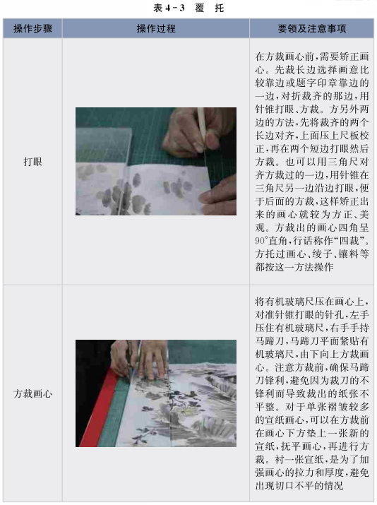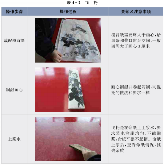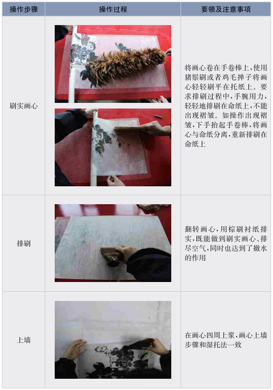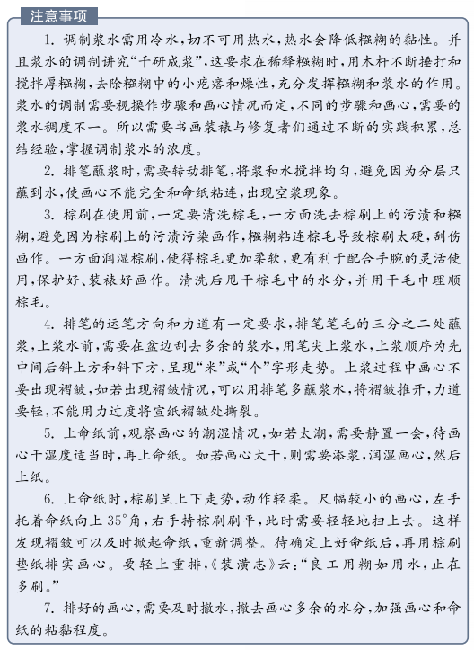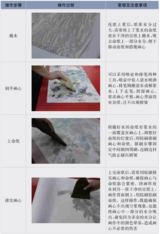托裱画心是书画装裱中的基础,画心托裱的好坏将影响整个裱件。托裱画心的要求有:平整不起褶,不出现晕染、掉色、失真等影响画意的情况。配托纸时应遵循:画心薄用厚纸;画心厚用薄纸,如条件允许,画心和托纸帘纹交错。根据画心的年代、破损、掉色情况,不同的画心需要用不同的方式。例如新画就需要蒸画、固色处理,防止画心跑墨和晕染。旧画托制要根据它的破损情况,确定它的托裱方式。一般情况下,托裱画心有两大类:湿托和干托。干托又分飞托和覆托。以下就这三种托裱画心的方式,进行详细的介绍。