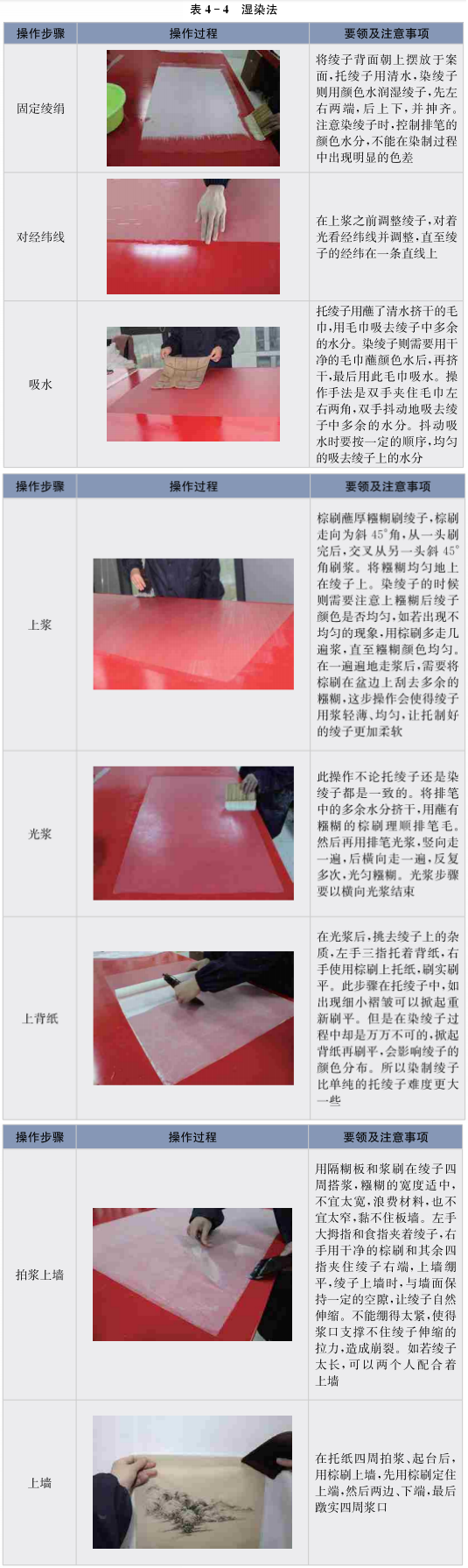 湿染法是托染绫绢中最常使用的方法,操作比较简单,步骤不烦琐,适用于绝大多数绫绢的托裱,尤其适用于浅色绫绢的染制。以绫子为例,托染绢的方法和绫子一样。只是托裱绢的糨糊要稍厚于绫子的糨糊。