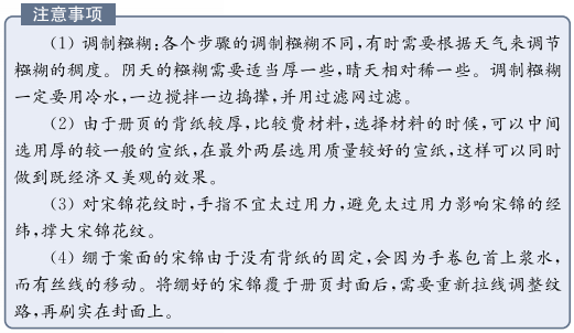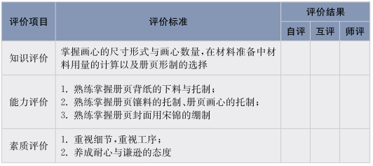 能力目标:熟练掌握册页背纸的下料与托制、册页镶料的托制、册页画心的托制、册页封面用宋锦的绷制。