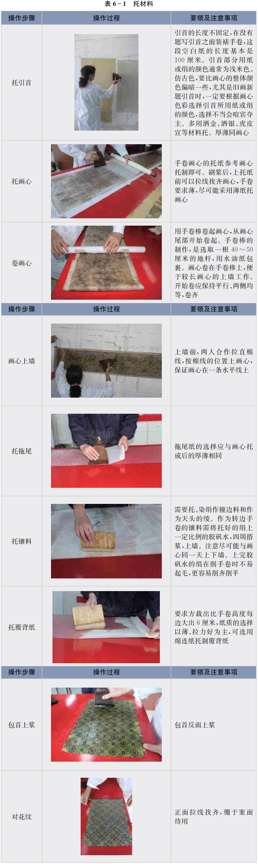 手卷装裱十分讲究,而且难度很大,需要有经验的裱画师根据画面的风格及内容进行精心设计,色彩效果典雅庄严,全卷布局协调统一。在装裱过程中要做到托裱平正,裁切准确,镶转精致,衔接严密,每一处细节处理均合乎规矩。