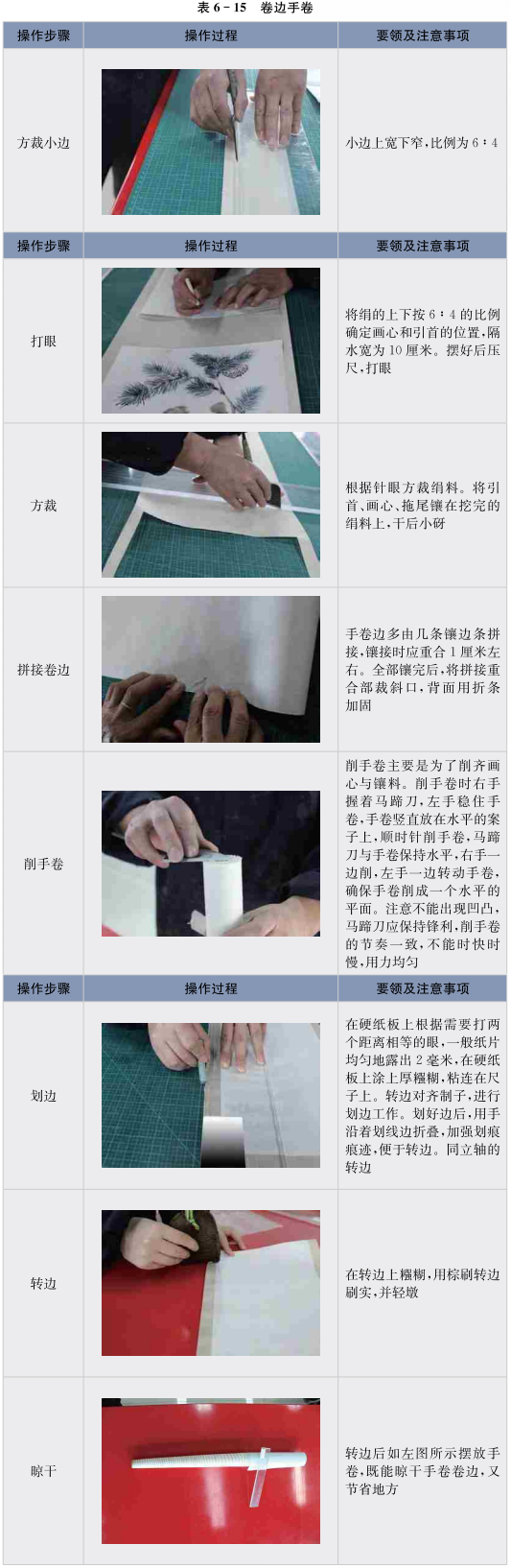 卷边手卷是手卷形式的一种,主要用于较长横幅的装裱。制作工艺与撞边手卷相似,只是在卷边的工艺上存在着些许差异。