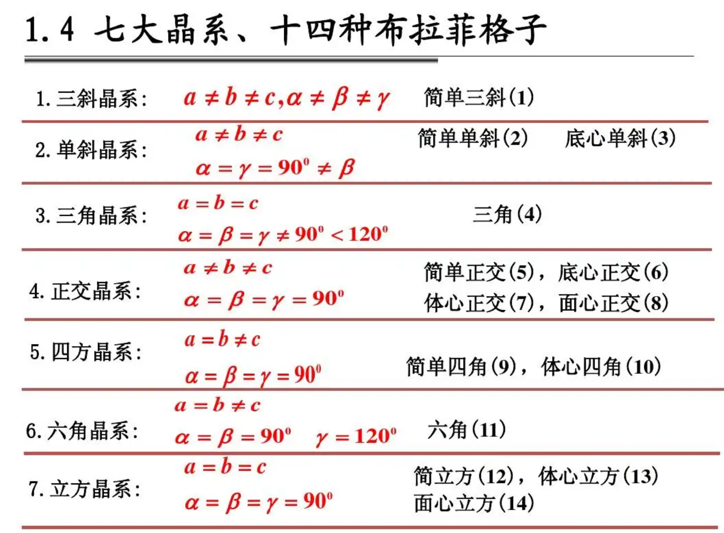 掌握七大晶系和十四种布拉伐格子的特征;