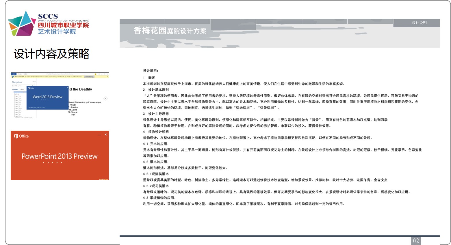 该工作任务是庭院景观设施设计实施的核心关键,是在上一次工作任务的基础上,对庭院项目的景观设施进行设计方案策划。整体设计方案的完成源自对本工作任务的设计内容的分析、定位、以及设计内容的完成,后期的工作任务都围绕本任务进行展开完成。在本次工作任务中需要用到OFFICE、PPT等软件,建议同学在使用中请安装2013以上版本的软件,有利于景观设施设计内容的编辑。
