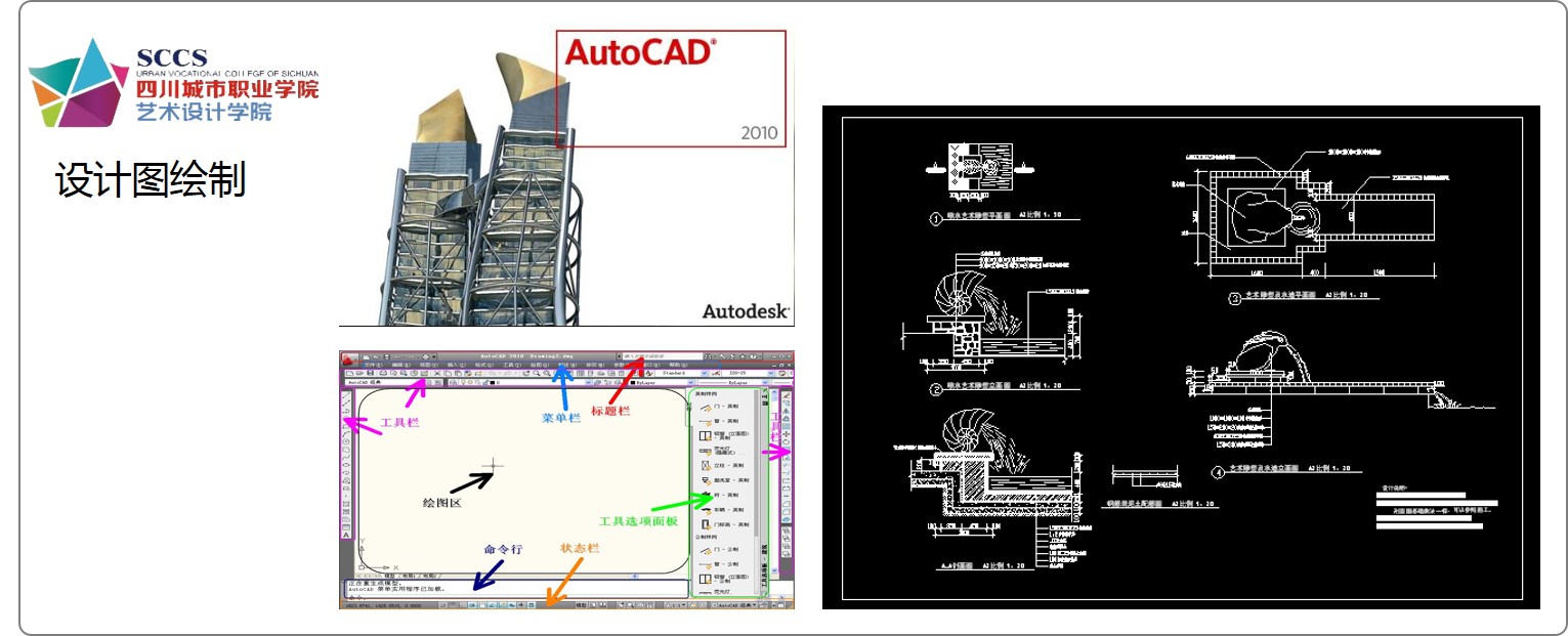 该工作任务是庭院景观道路铺装设计方案的图纸表现部分,每一个设计想法的表现都需要通过图纸进行表达,因此在本工作任务的学习中,需要同学们熟练运用AUTOCAD软件。同时完成的CAD的图纸将会影响下一次工作任务效果图的表现。建议同学在使用中请安装2010以上版本的软件,有利于景观设施设计图的绘制。