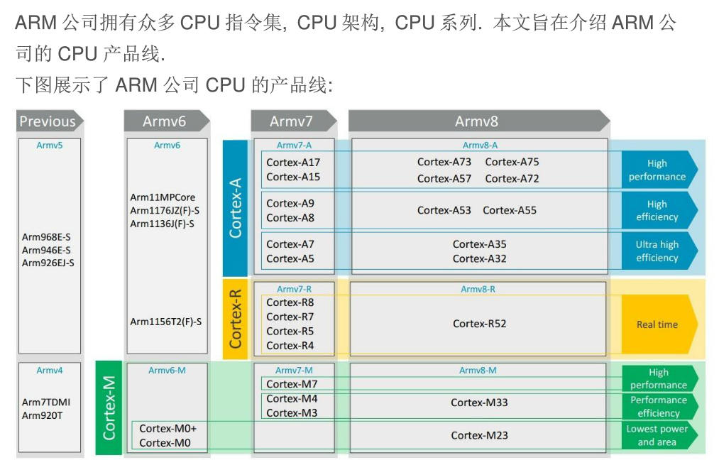 ARM9 系列 ARM9E 系列 ARM10E 系列 SecurCore 系列 Intel 的 Xscale Intel 的 StrongARM 其中, ARM7、ARM9、ARM9E和ARM10为4个通用处理器系列,每一个系列提供一套相对独特的性能来满足不同应用领域的需求。 SecurCore 系列专门为安全要求较高的应用而设计。