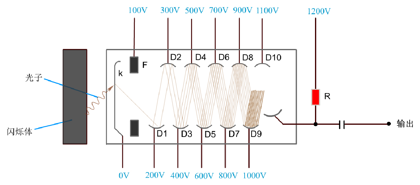 射线晶体内产生荧光,光导和反射器组成的光收集器将光子投射到光电倍增管光阴极上,击出光电子,光电子在光电倍增管内倍增、加速在阳极上形成电流脉冲,电流脉冲高度与射线能量成正比,电流脉冲个数与辐射源入射晶体的光子数成正比,即与辐射源的活度成正比。