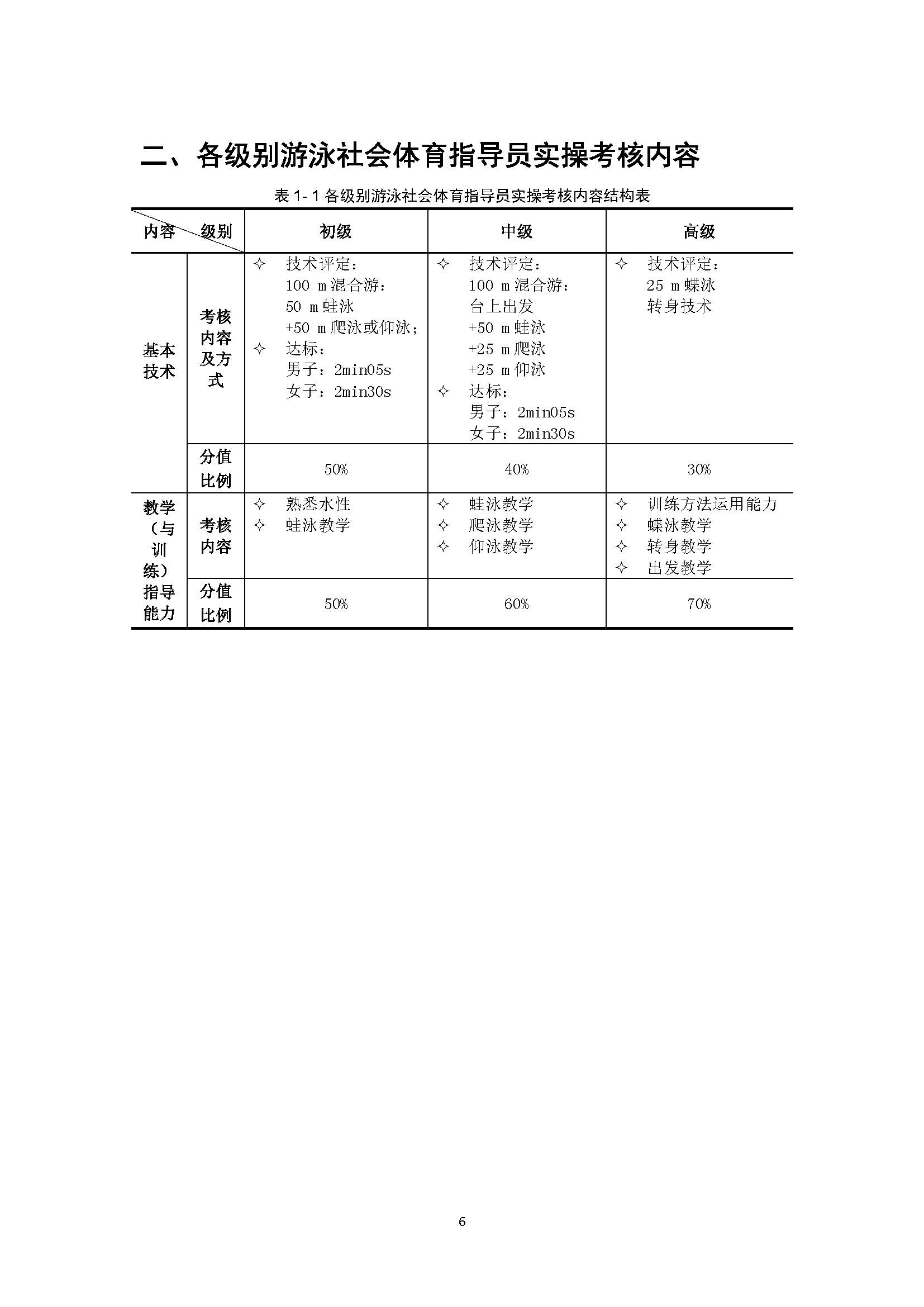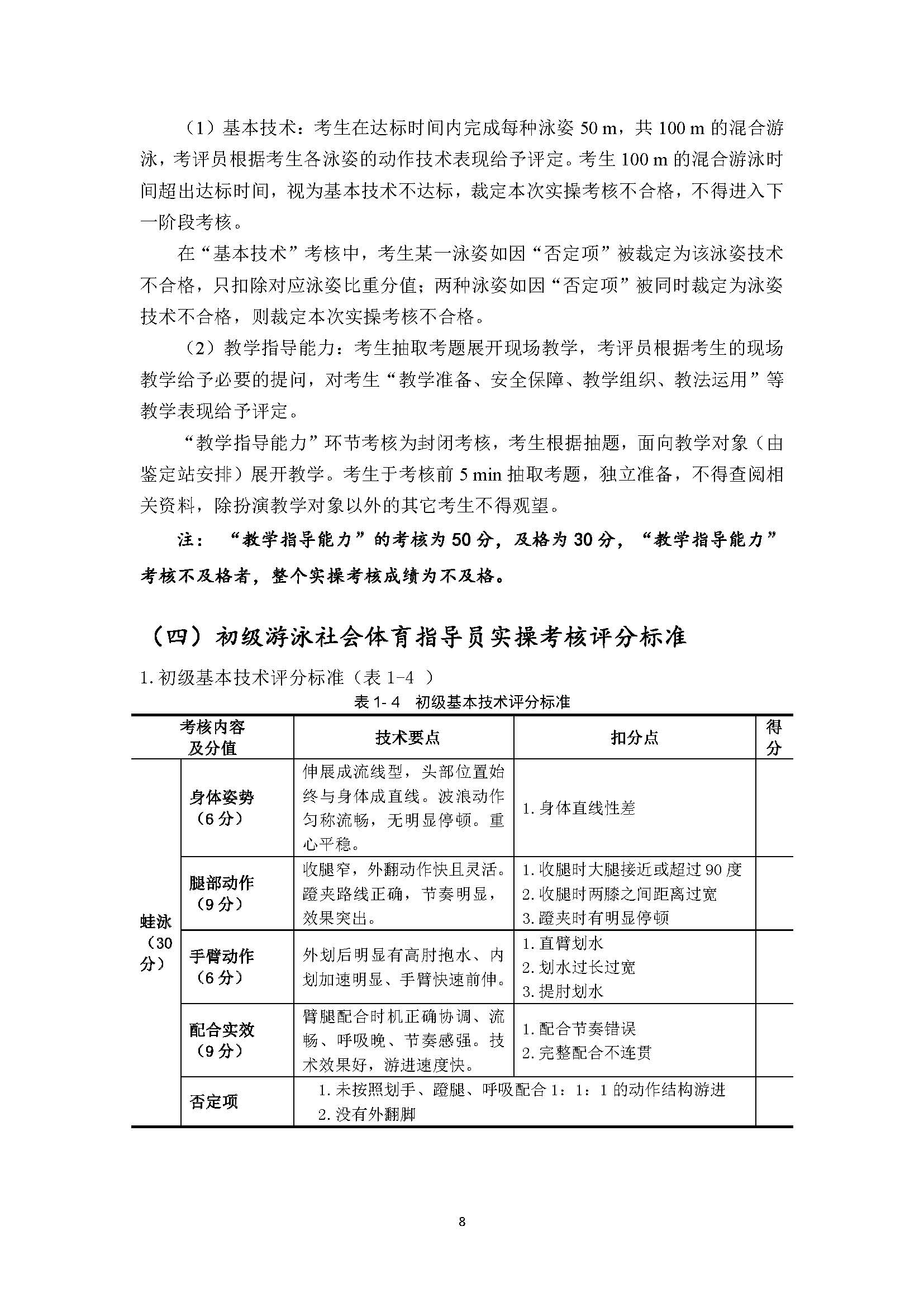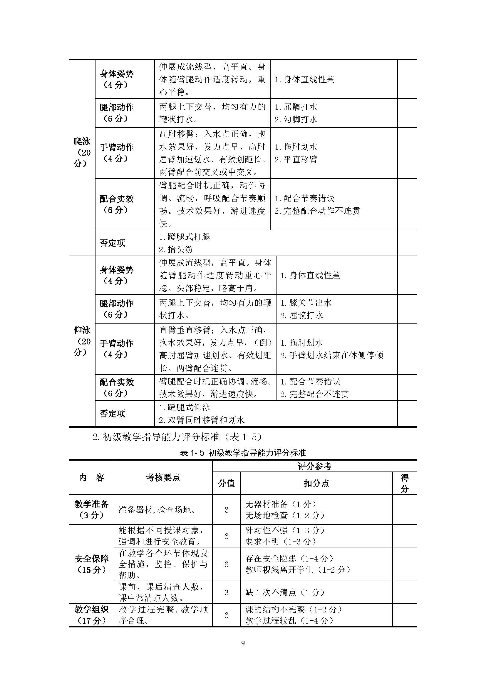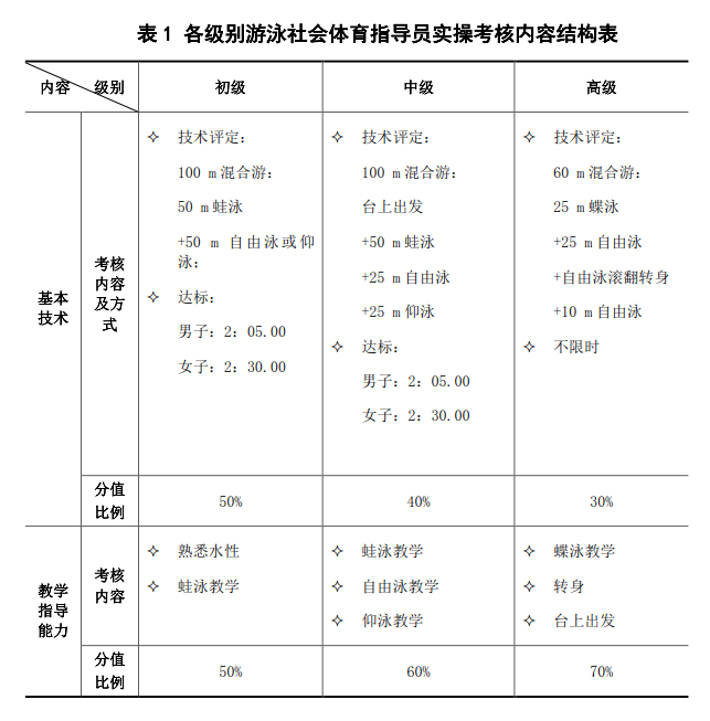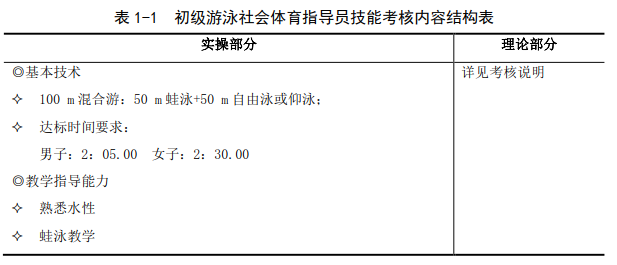 (一)初级游泳社会体育指导员技能考核内容(表1-1)