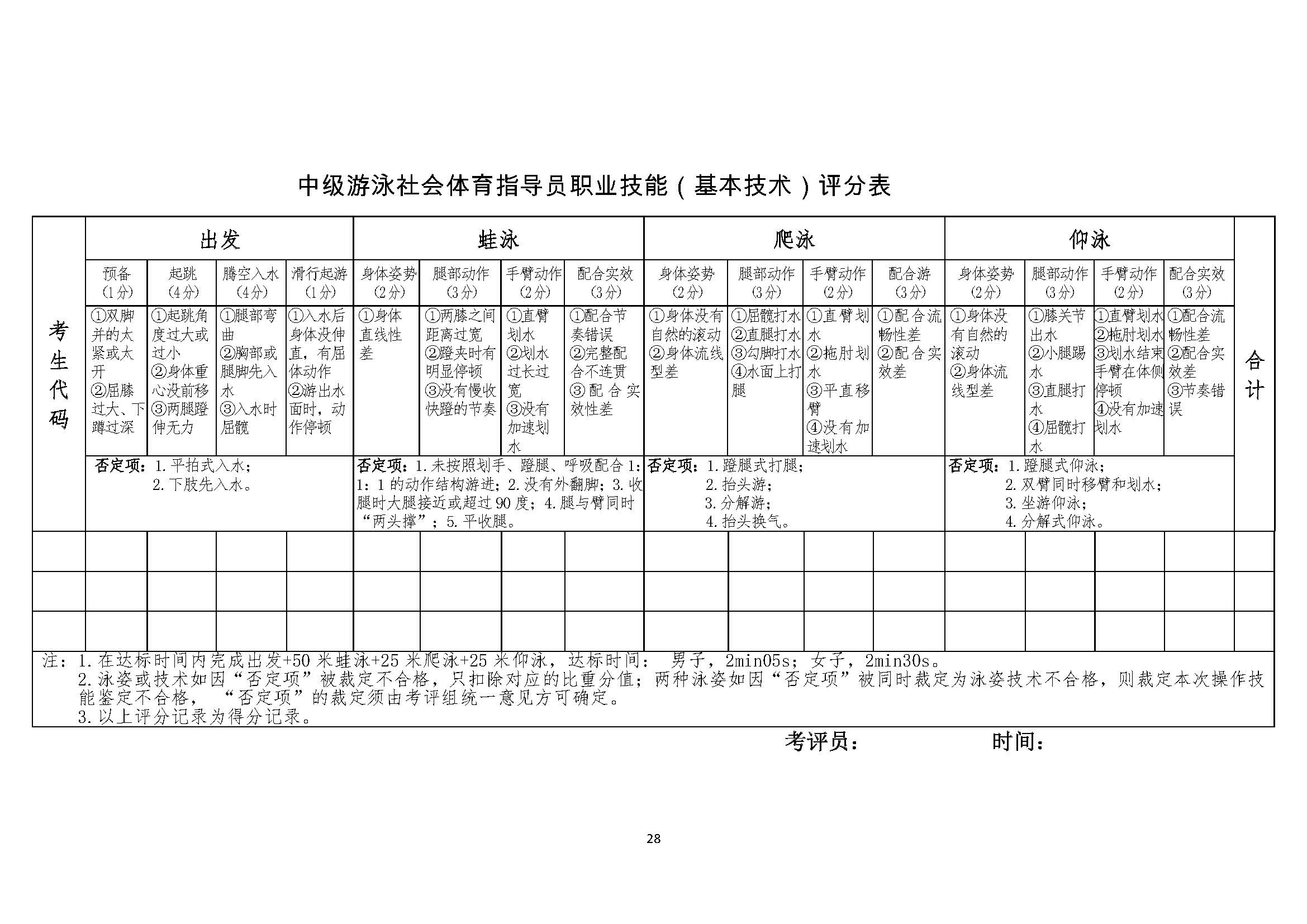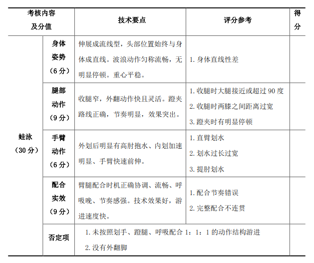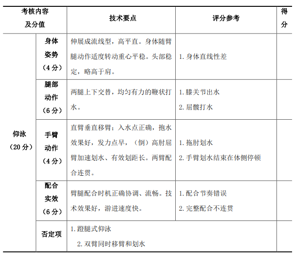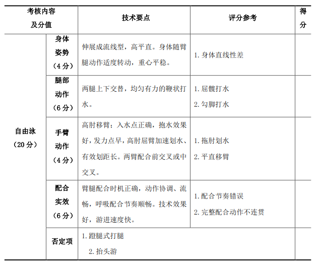 在“基本技术”考核中,考生某一泳姿如因“否定项”被裁定为该泳姿技术不合格,只扣除对应泳姿比重分值;两种泳姿如因“否定项”被同时裁定为泳姿技术不合格,则裁定本次实操考核不合格。
