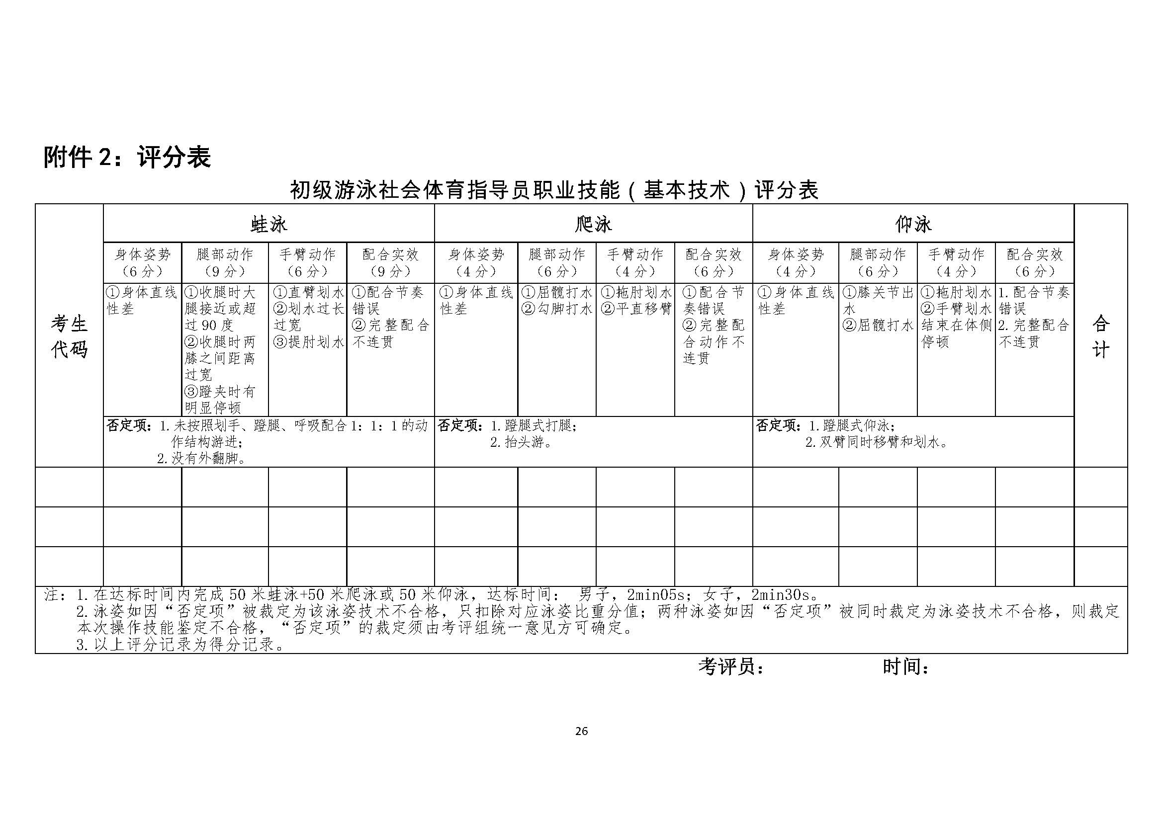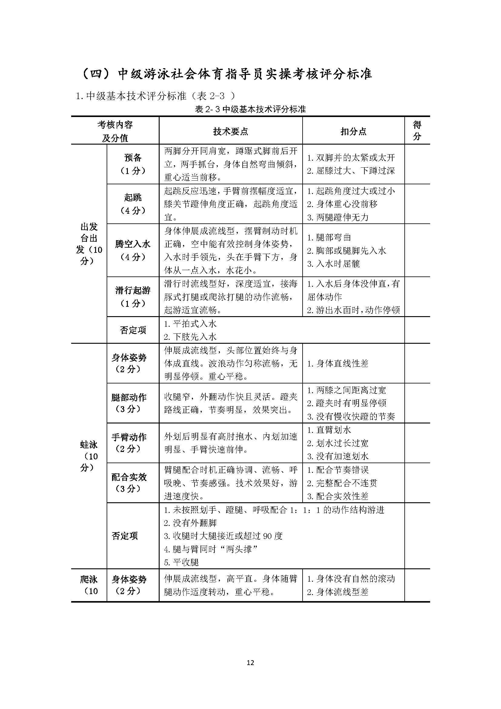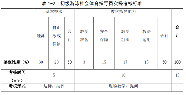 (二)初级游泳社会体育指导员实操考核标准(表1-2)