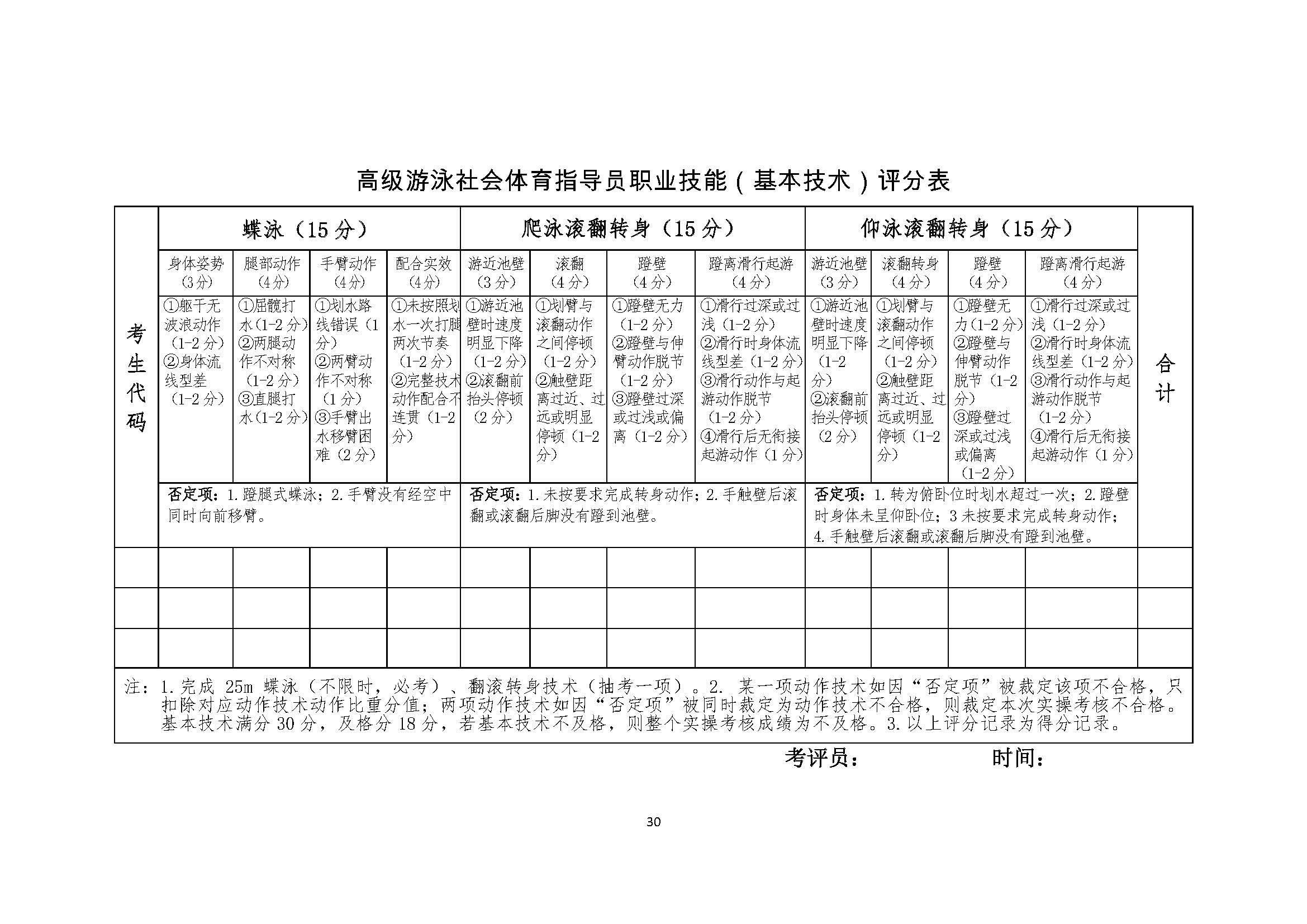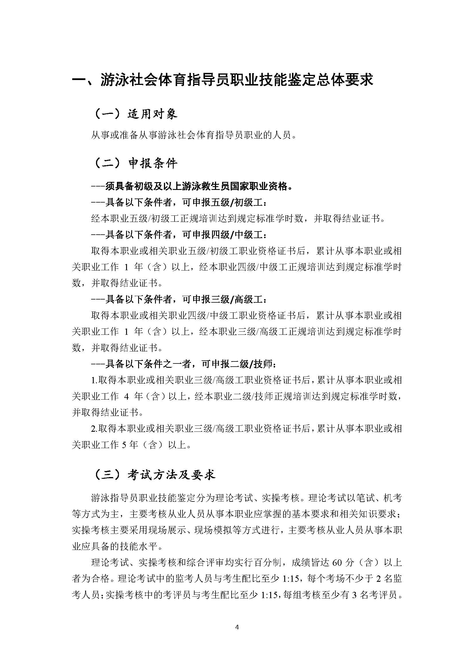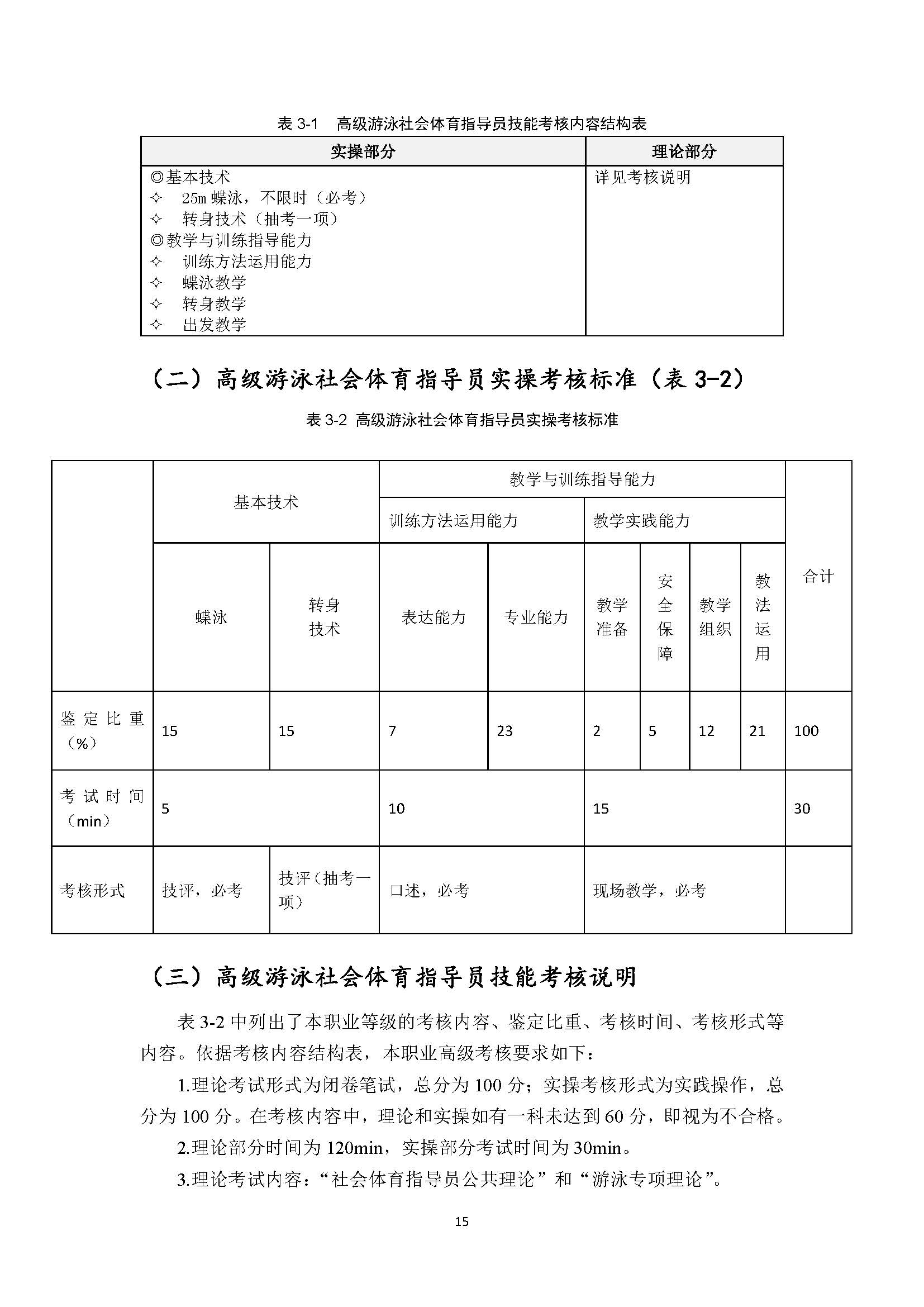 游泳社会体育指导员职业技能鉴定包括理论考试和实操考核两部分。理论考试试题从国家试题库统一抽取,组成试卷;实操考核根据各级别游泳社会体育指导员考核标准由考评员进行统一考核,两项成绩均合格者,颁发《游泳社会体育指导员国家职业资格证书》。