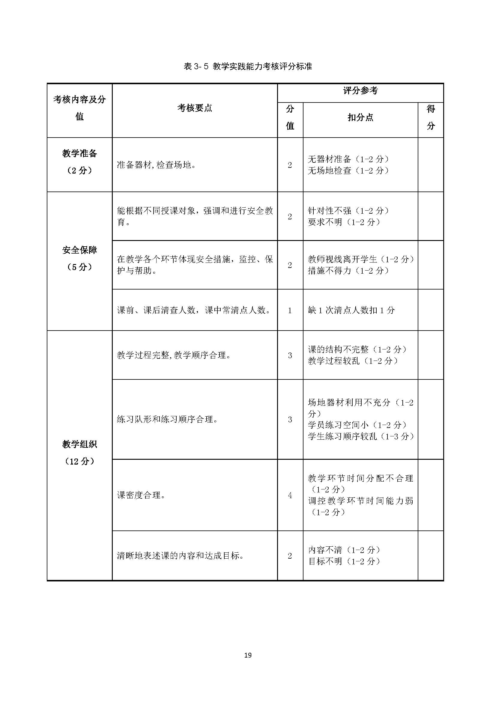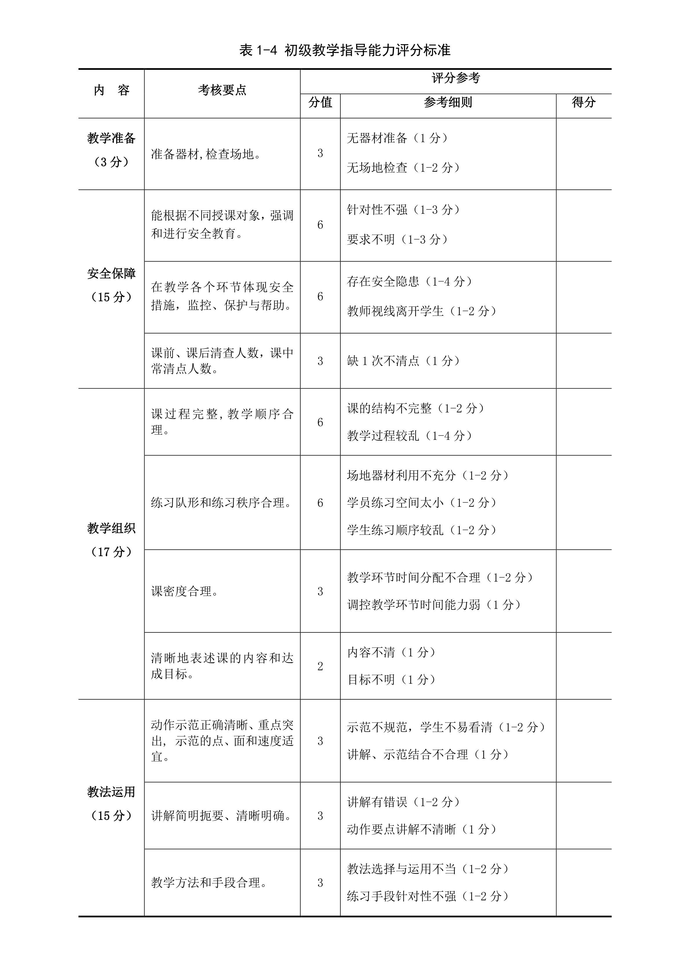 (2)教学指导能力:考生抽取考题展开现场教学,考评员根据考生的现场教学给予必要的提问,对考生“教学准备、安全保障、教学组织、教法运用”等教学表现给予评定。