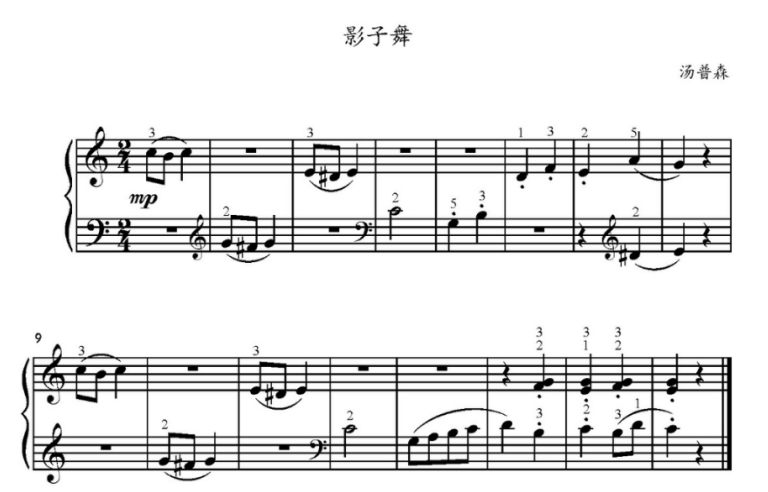 演奏提示:本曲结合了二音、三音和多音连线的奏法,要认真读谱正确弹奏。同时要注意三拍子的强弱规律。