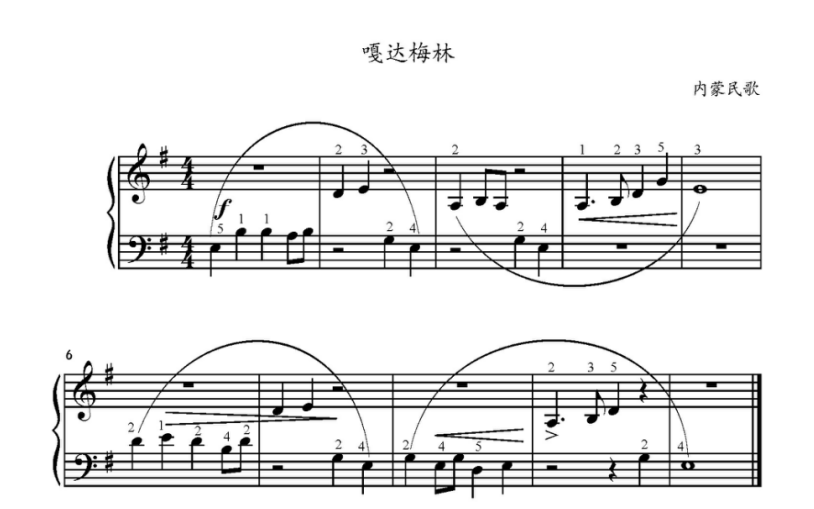 演奏提示:这是一首内蒙古民歌,弹奏时左右手的衔接要紧凑,声音要连贯。注意乐句的划分,音乐要有歌唱性。
