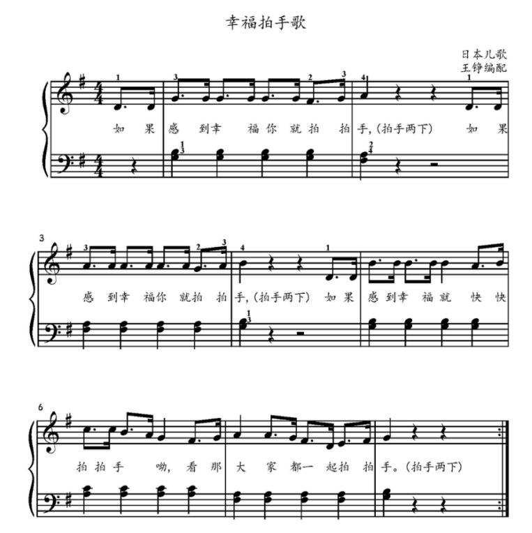 演奏提示:《幸福拍手歌》原是一首西班牙儿歌,传到日本后,经过重新作词和编曲(1964年)在节奏跟音调方面都有很大的改动,成为现在的版本,并广为传唱。连续的附点节奏富有动感,使本首歌曲充满了欢快、活泼的情绪。