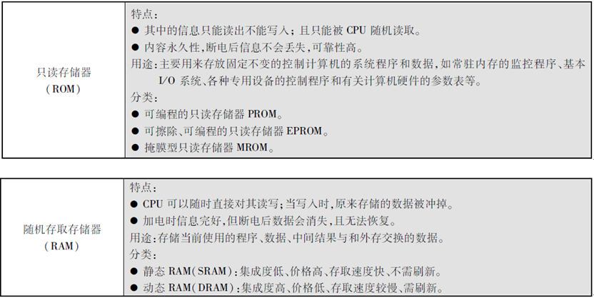 计算机的存储器可分为内部存储器(简称内存储器、内存或主存)和外部存储器(又称为辅助存储器,简称外存储器、外存或辅存)。