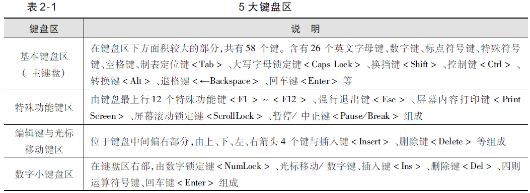 键盘分为5个区域,各区域大致功能见表2-1。