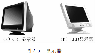 显示器(Monitor)又称监视器。它是计算机必不可少的外部设备之一,用于显示输出各种数据。常用的显示器有阴极射线管显示器(CRT)和液晶显示器(LED)两种,如图2-5所示。