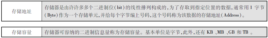 存储器是存放程序和数据的部件,可存储原始数据、中间计算结果及命令等信息。下面先介绍与存储相关的两个概念。