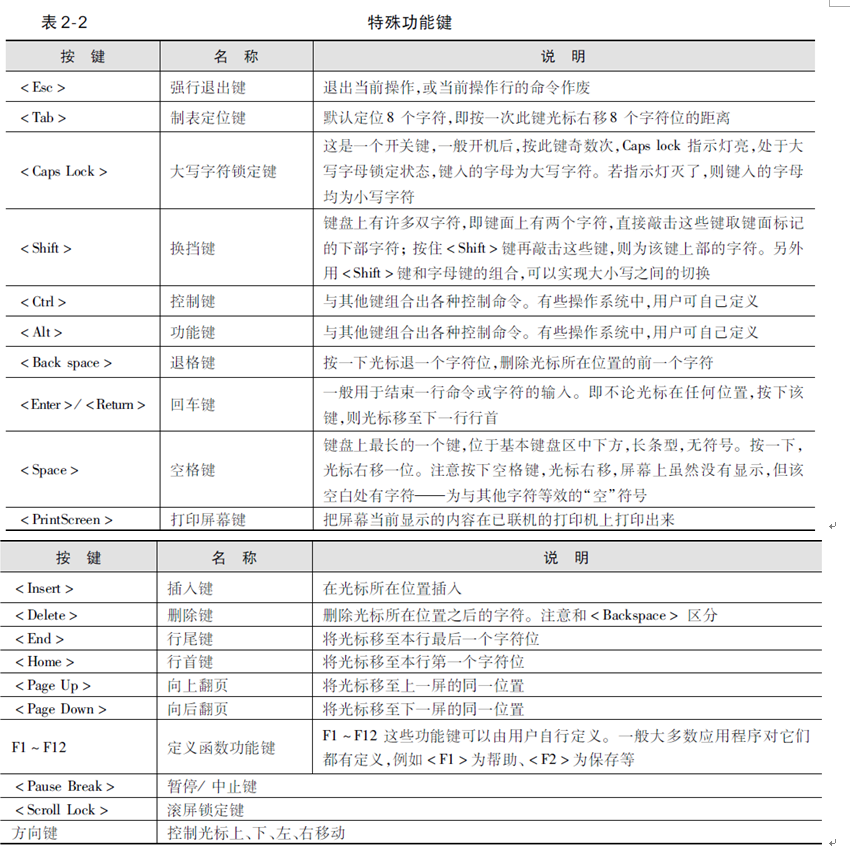 键盘中的一些按键本身有特殊功能,也是我们经常用到的,下面进行简单的介绍,见表2-2。
