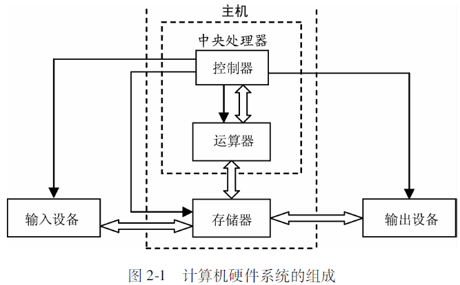 现代电子计算机由运算器、控制器、存储器、输入设备和输出设备5大基本部件组成,以存储器为中心,基本框架如图2-1所示。