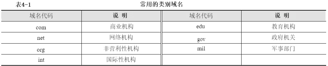 我国的第一级域名是cn,第二级域名也分为类别域名和地区域名。其中地区域名有bj(北京)、sh(上海)等。类别域名见表4-1。