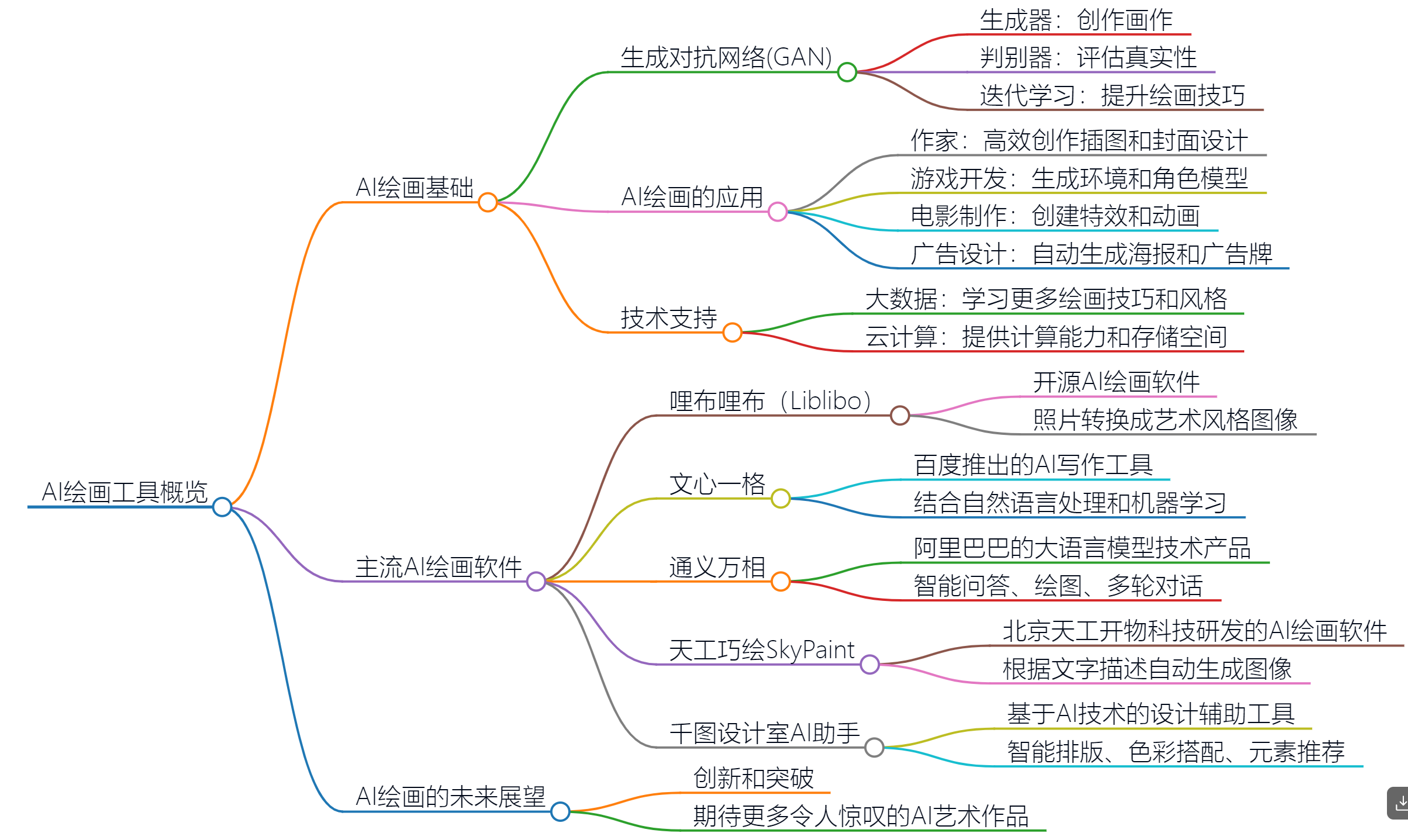 部分的核心要点是:AI绘画利用人工智能技术,特别是生成对抗网络(GAN),使计算机能够生成或修改图像和艺术作品,为艺术创作带来新可能,改变了创作和欣赏艺术的方式。GAN由生成器和判别器组成,通过迭代学习提升绘画技巧。AI绘画在现代写作、游戏开发、电影制作和广告设计等领域有广泛应用,且得益于大数据和云计算的支持,提高了绘画效率和质量。总之,AI绘画是一种创新技术,正不断推动艺术创作领域的创新和突破。