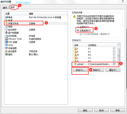 3)关于第4步和第5步操作,本虚拟机使用的共享文件夹路径为:C:\Users\apple\Desktop\temp\upload。大家应该根据自身电脑的情况,新建文件夹,比如在桌面上新建文件夹,推荐最后一级文件夹的名字是upload,然后第第4步添加路径,并在第5步选上√。务必确保路径和文件夹都是有效的。