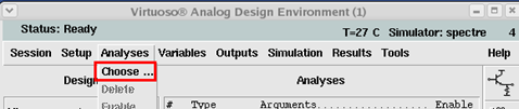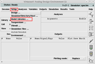 完成原理图的编辑之后,在schematic视图中中通过菜单项Tools > Analog Environment启动VirtuosoAnalog Design Environment(ADE);在ADE界面通过菜单项Setup >Simulator/directory/host打开Setup对话框,选择使用spectre 仿真器;之后在ADE界面通过菜单项Setup >Model Libraries打开Model LibrariesSetup对话框,通过Browse按钮选择使用的库文件,section部分设置为tt,具体操作如下图。