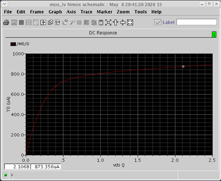 该图则是当Vgs=1.5V时,Vds从0~2.5V变化,漏电流Id的变化特性曲线图。
